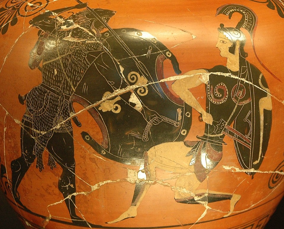 En la imagen del segundo poema, ánfora ática de figuras negras, donde Heracles lucha contra las amazonas, 530 a. C.–520 a. C., Museo del Louvre